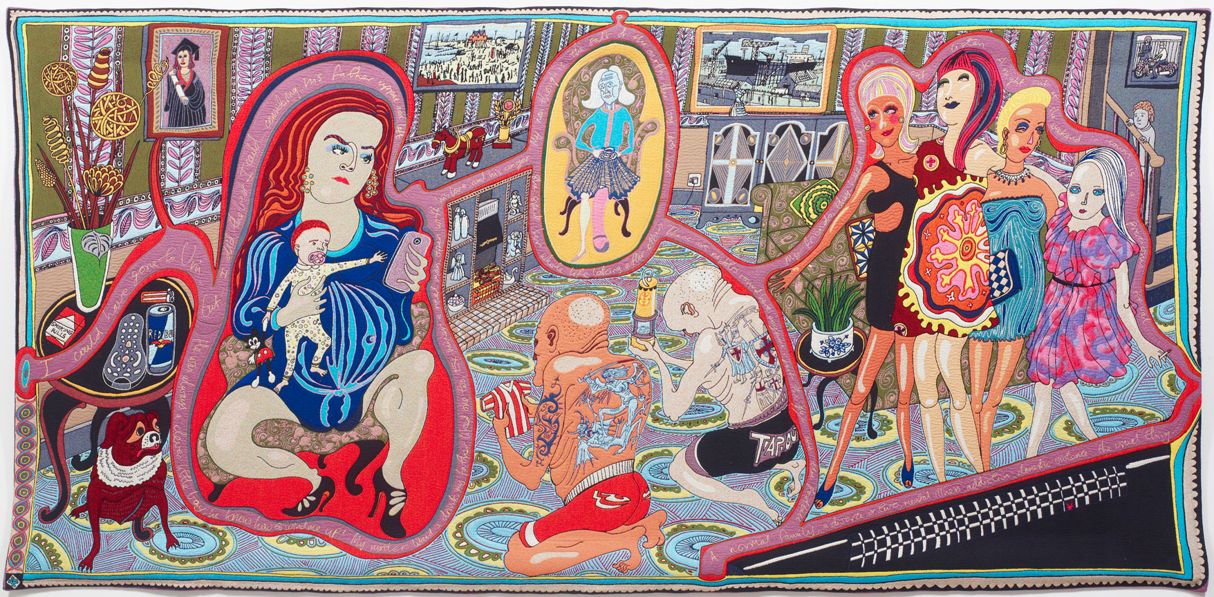 The Vanities of Small Differences consists of six tapestries loosely based on William Hogarth’s A Rake’s Progress and telling a similar story of social mobility in the modern day. Perry follows his protagonist, Tim Rakewell, as he rises from his working class roots in Sunderland to a Cotswolds country manor, in order to dissect ideas of class and taste. He begins with a scene in a Sunderland living room where four girls and Tim’s mother are all dressed up in their finest attire for a night on the town and having, as Perry notes, already been on the “pre-lash”. Sartorially patterned short dresses dominate, and in the centre of the room, are two topless, tattooed mixed martial arts fighters presenting the child with icons of a Sunderland football shirt and a miner’s lamp, emphasising the North East’s industrial heritage. Tim’s father is notably absent, and on the far right of the tapestry Tim appears again on the stairs, according to Perry: “facing another evening alone in front of a screen.”