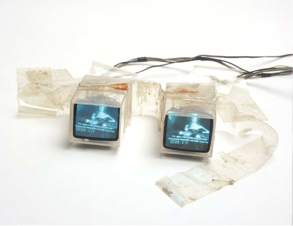With no body to mould, they draw a circular perimeter around the empty white surface of a display plinth, symbolising the absence of Moorman’s body from the exhibition. A safety pin punctures the vinyl and alludes to how this object would have been secured onto Moorman’s body during her TV Bra performances. The object is marked by the wear and tear of these performances: Moorman’s dripping sweat and secretions have stained the transparent vinyl straps [fig. 2]. In another photograph, the bra’s television ‘cups’ light up to show Moorman performing TV Bra [fig. 2]. She is immortalised in the pixels of the video and the stains on the artwork. In fact, Moorman’s presence in TV Bra’s screens realises Paik’s assurances that ‘video guarantees eternal life’.[3] Moorman seeps through TV Bra’s materiality and into the plexiglass boxes that shelter its television screens.