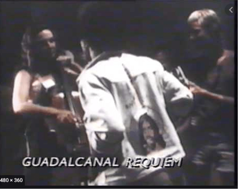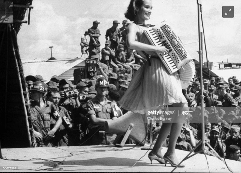 Moorman’s TV Bra performances repeat the intelligible tropes of her gender to highlight their plasticity. Her engagement with the bra and the media recalls Butler’s claim that ‘media and survival are linked’, as media and television are ‘modes of representation and appearance that allow the claim of life to be made and heard’.[45] Moorman’s TV Bra performances play with other ‘modes of representation’, as epitomised in her trip to Guadalcanal in 1976. There, Moorman enters into an uncanny dialogue with the 1968 Miss America protesters who claim that Miss America is the ‘[the USA’s] Military Death Mascot’ and the ‘cheerleader […] of American troops [in Vietnam]’. [46] Yet rather than visiting American troops in Vietnam, Moorman performs for the inhabitants of Guadalcanal, who suffered during the United States’ first major offence against the Japanese in World War II. Read beside a photograph of Jane Ann Jayroe, Miss America of 1967, cheerfully playing her accordion for the American troops in Vietnam [fig.7], Moorman figures as the avant-garde’s ‘cheerleader’, entertaining the disenfranchised lives of the Guadalcanal inhabitants with her TV Bra.