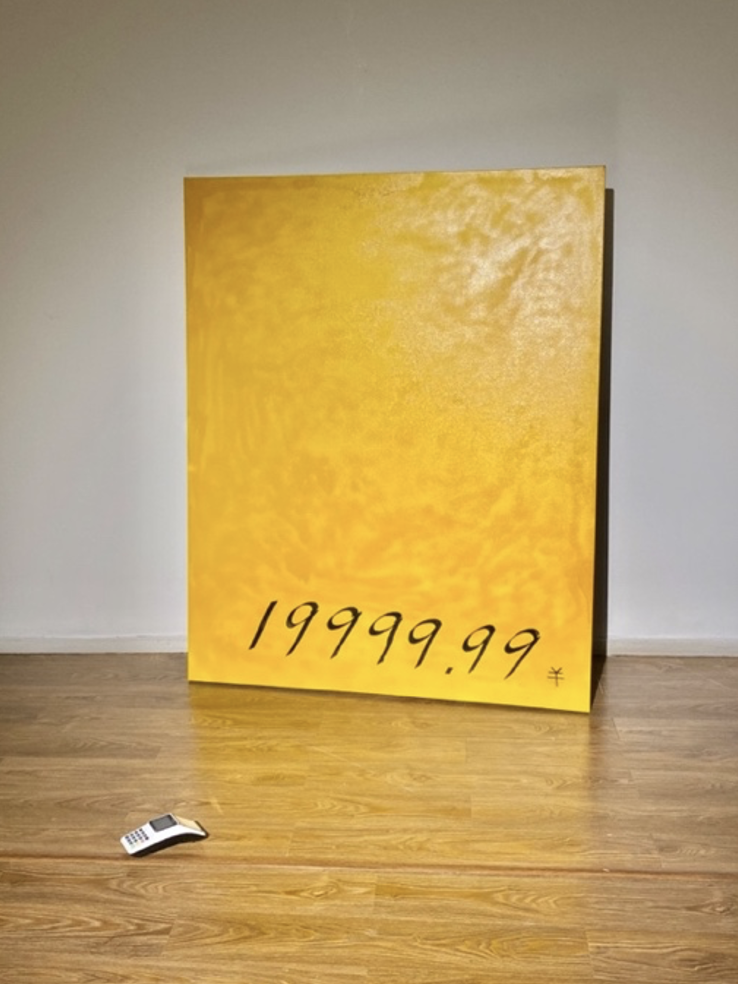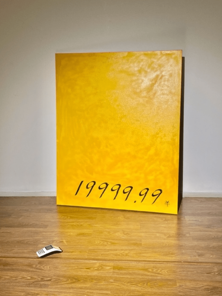 To the left of Blind Sidewalk were three acrylic paintings hung on the wall to form a series: 19999.99, 3999 2999 and 998. Wang painted a string of price numbers directly onto the bright orange canvas with black paint and set up a POS machine on the floor next to 19999.99 (pictured, below), inviting the spectator to reflect on the commercial logic and consumerism of the art world.