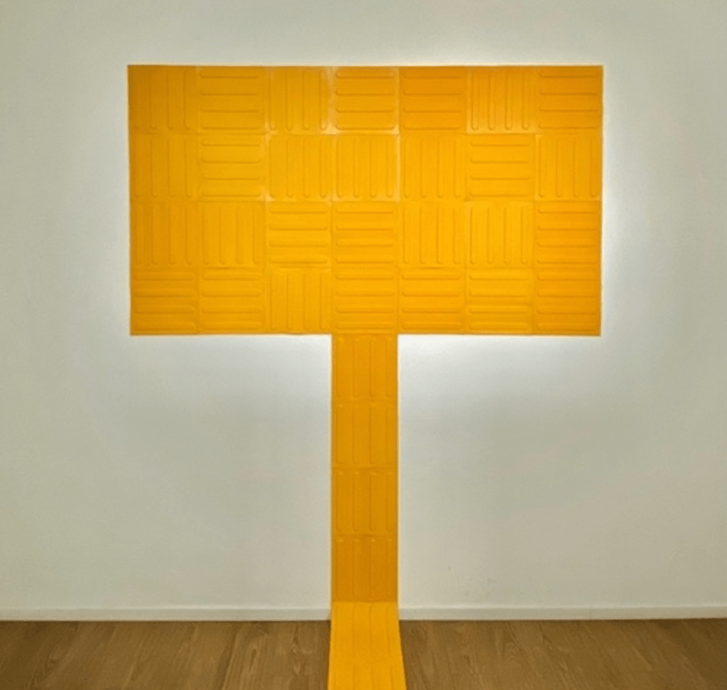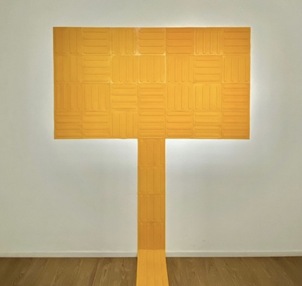 Wang’s works, however, focus more on contemporary modernity and urban themes and tend towards the dialogic. The comprehensive material work Blind Sidewalk (pictured, below) shows Wang’s concern for the urban life of minority groups. This work extended from the entrance of the exhibition hall to the wall of the indoor art gallery, forming a 104 cm × 182 cm rectangle composed of 28 bricks. The blind sidewalk is a tactile paving designed for use by vision-impaired people, using touch as the guiding direction. It is always painted bright yellow and has a unique stripe pattern. In Wang’s work, the blind sidewalk became the boundary of visual guidance and part of the exhibition space. The raised stripes are like the static eyes of the blind. The moment they touch is a challenge to the border between reality and fantasy. With this kind of tracking layout, and in making art enter a preexisting space, this work connected the vertical and horizontal planes of three-dimensional space, challenged the established artistic thinking, and provided the possibility for the construction of a new aesthetic relationship based on inclusivity.