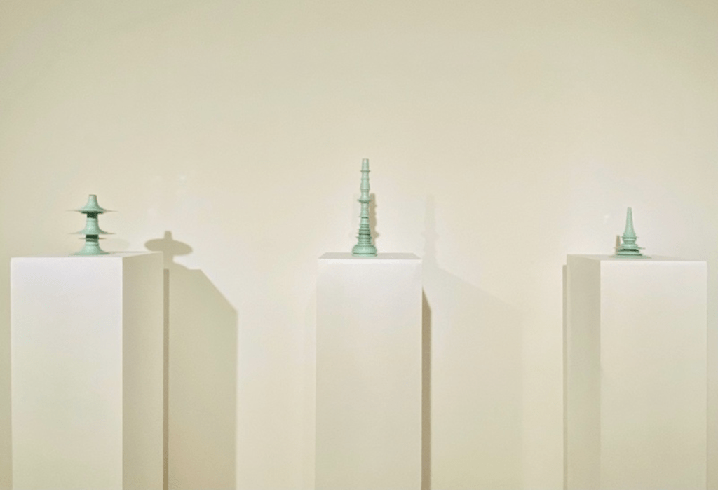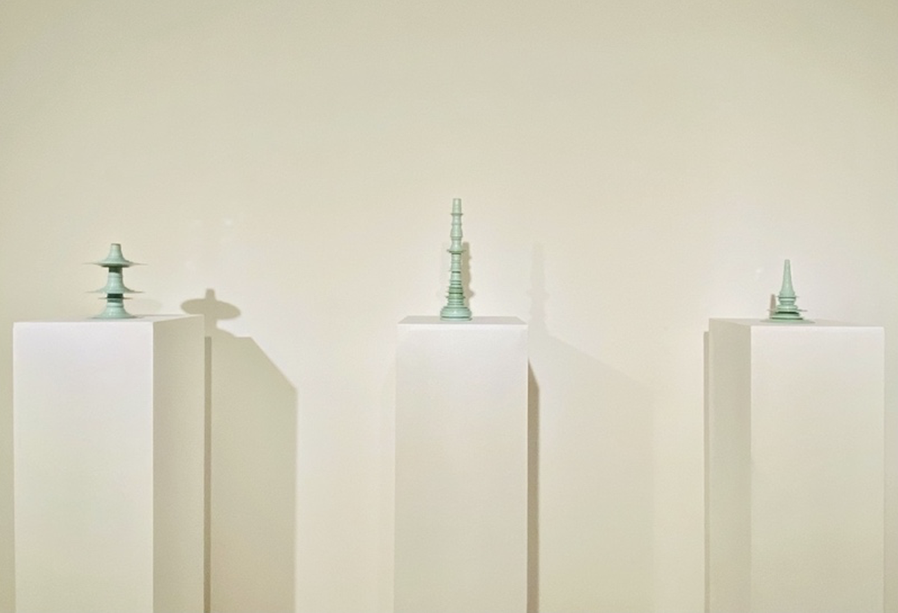 His interactive sculpture Echo Kiln (pictured, below) was an interdisciplinary work, drawing on lessons from modern science and technology and intervening in debates around the involution of contemporary Chinese art. Three grey-green sculptures produced by a 3D printer were displayed on three 1.5-metre-high white stands. By scanning an accompanying QR code and photographing the grey-green sculptures, the audience hears different kinds of sounds recorded by the author, such as broken or beaten porcelain. Sounds and images are the media for people to transmit information and exchange; they constitute thought and shape daily life. Transforming sound into tangible sculptures, intentionally creating a bridge between the two media and blurring the viewer’s understanding of both, Wang provides a new way of thinking about the relationship between the two.
