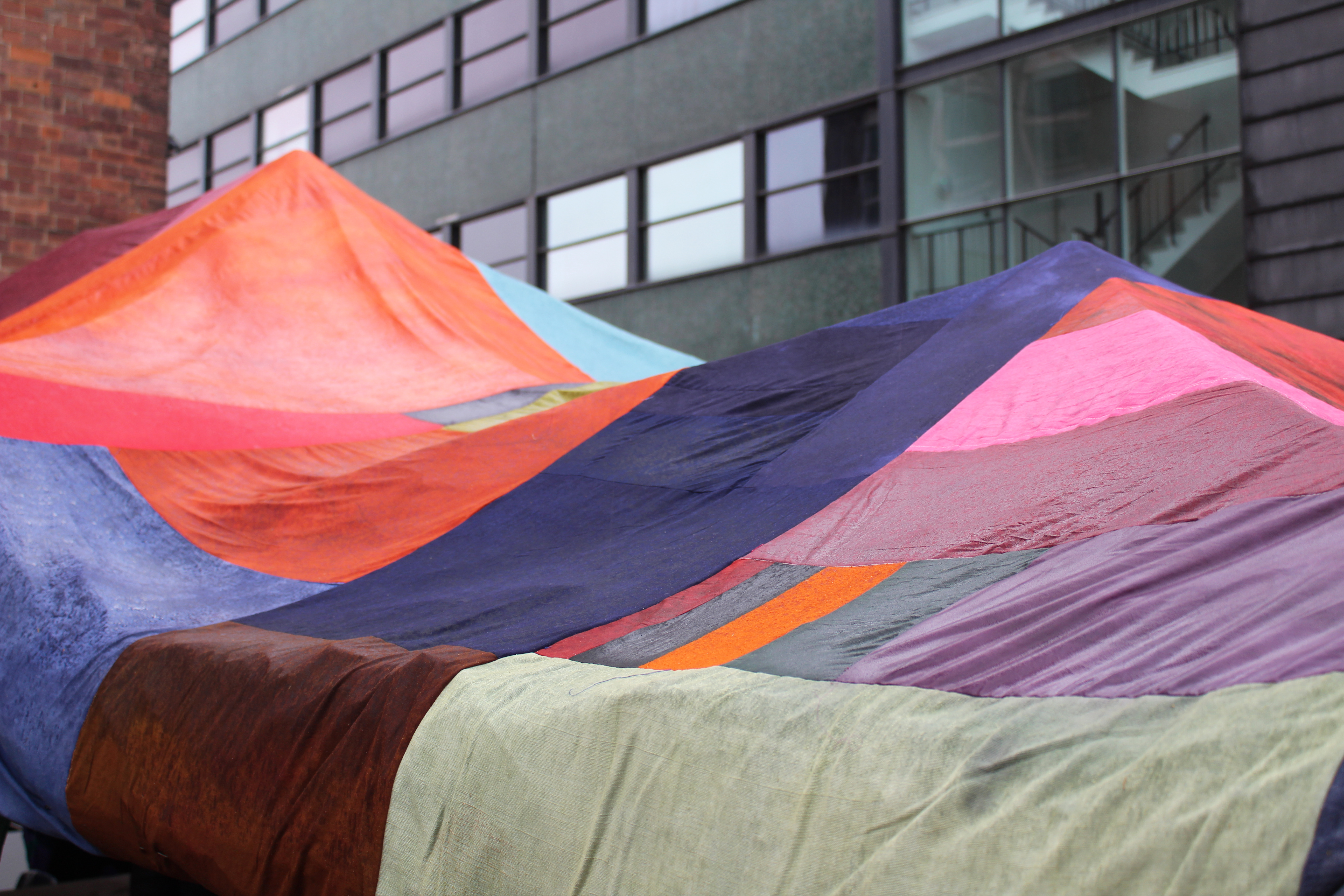 I head outside, get some tea and cake, and catch up with friends under a huge and richly-dyed patchwork quilt by Sophie Giller. It reminds me of Liam Gillick’s colourful semi-architectural propositions, that I think are meant to ‘frame social encounters’. Rather than his cool, slick industrialism, Giller’s work feels more vibrant, riotous, hand-made: I find it gleeful and inviting. I also admire the outcome of Effy Harle’s ‘well dressing’ workshop, apparently a local Derbyshire tradition. Kids have been pushing flowers into – and mounting strange gargoyle faces upon – a huge slab of wet clay, that surrounds a gently trickling fountain. The result is luscious and strange. I head inside to Famicom Express, a DIY press for alternative comics run by Leomi and Stef Sadler. It runs mostly online and by post: another model to gather and support artists. I leaf through some of their zines and prints: they are crude, inventive, sexy, unnerving and hilarious.