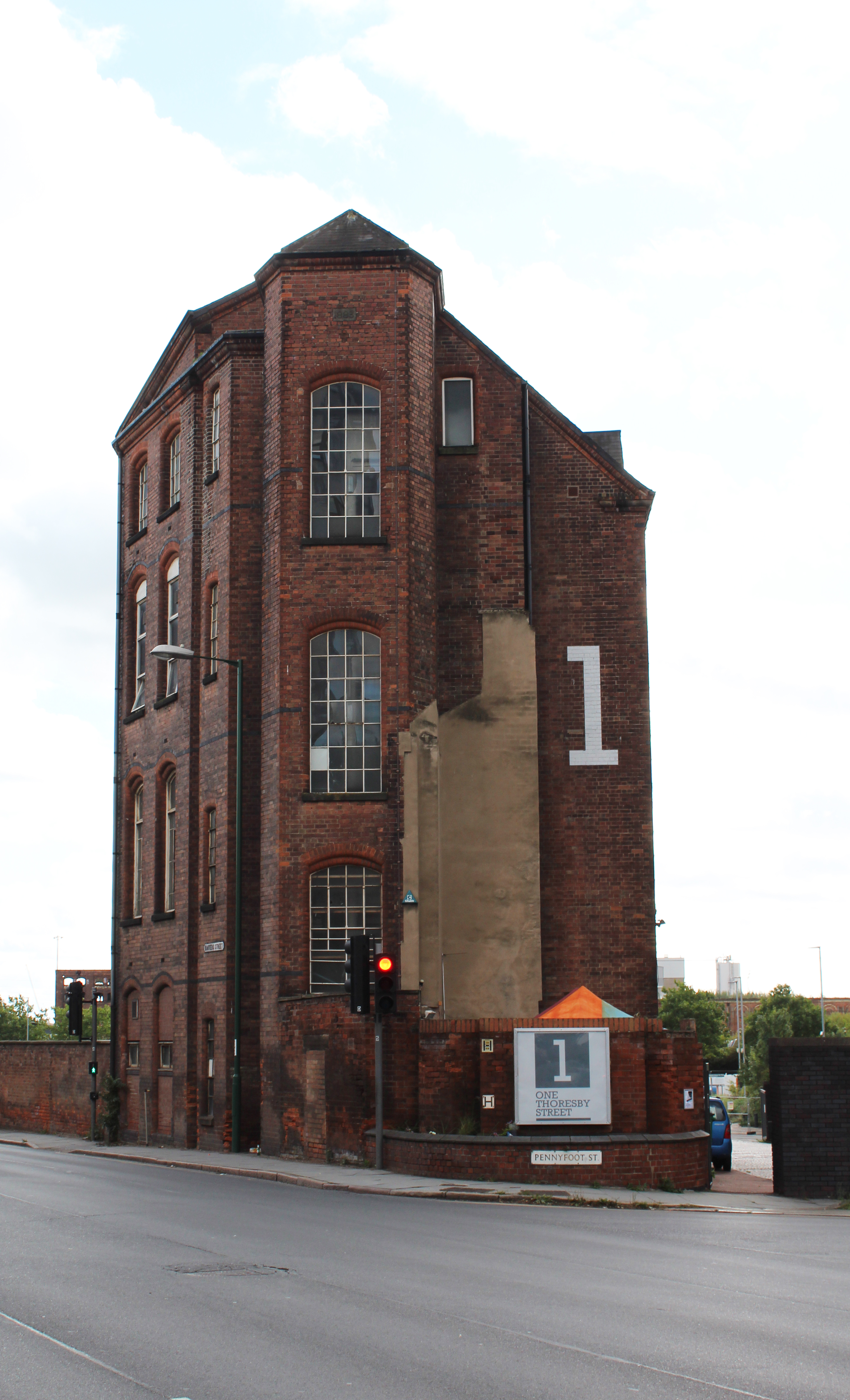 I’m at One Thoresby Street: that tall, lonely brick building perched between BioCity and the busy A612 that separates east Nottingham from the city centre. A wall has been removed since I last visited: GasLeak Mountain’s exhibition space on the ground floor has expanded into a recently vacated studio. The current show (Roddy McDowall by Daniel Cowlam) has been moved to one side, and the space is filled with chairs, a projector, a desk, a PA system and a microphone. Studio holder Kathryn Cooper is near the end of her talk on the history of the building.