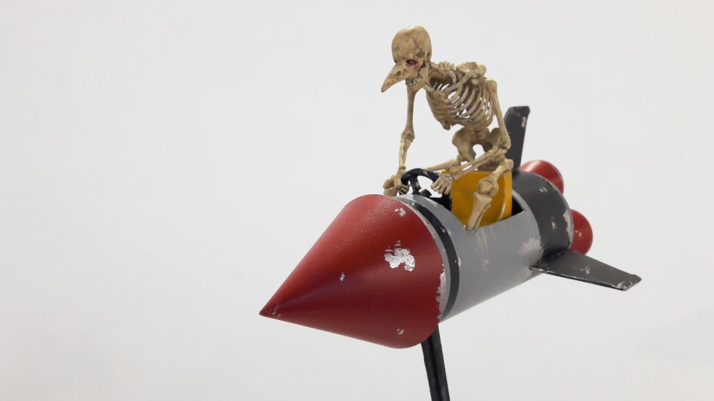 Destruction, in the internal logic of the diorama, would also be a fatal kind of animation. If the croquet mallet came swinging down the ball would roll forward, out of its fragile order, and off the cosy snugness of the shelf, towards us. The sculpture would be brought to full, three-dimensional life even as its parts fell to their death. (Hanmer’s sensitive to the uncanniness not only of stillness, but also deathly kinds of motion: one sculpture, a skeletal figure crouching in the cockpit cut out of a stocky little warhead, invites the viewer to press and hold the red button; the rocket writhes on its tether, lamely and pointlessly, like a post-nuclear nightmare of a bucking bronco.) Whatever these guys are possessed with, it’s not far from the death drive: they’re full of rubber plans to get rid of themselves, but they want to take us with them.