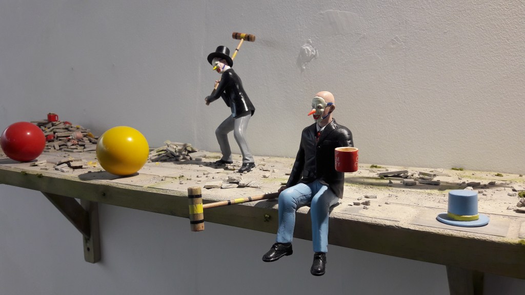 One scene explores in particular depth this dynamic of hostile spectacle with its ambivalent demanding and rebuffing of attention. In a brighter key than the bone sculptures, Keep Your Distance replaces humanoids with little figures the size of Action Man. Two of them wear masks, an allusion to the stock figures from commedia dell’arte (but also suggestive of an archetypal evening of contemporary excess, an orgiastic party of the ruling classes, hosted at 5 Hertford Street or somewhere near Chipping Norton, by someone who went to school with Carrie Symonds). Three of them occupy a wooden shelf, on the edge of which balance five pool balls, neatly alternating garish yellow and red. A yellow smiley face is printed on a grimy flag which flies in one corner. They’re engaged in wanton destruction. The central figure wears a sky-blue bow tie and a ringmaster’s top hat and jacket; he wields a croquet mallet, scowling at the yellow ball he is about to whack. To his left, a blue-trousered gent sits dangling his legs off the shelf, top hat by his side, resting his own mallet while he enjoys a tea break. At the other end, the third figure bends to roll a red off the shelf, to its doom.
