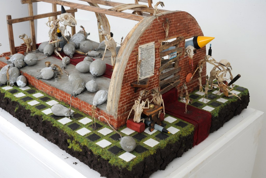 Peter Hanmer, a sculptor and installation artist from the north-east of England, has a distinctive love of allegory. His dioramas are populated by figures slightly less than human: little men with clown’s faces and beaked noses; humanoids made of bone. The beaked figures are usually wreaking havoc, while the terrifying humanoids are staging elaborate rituals – punishments and exaltations taking place around weird structures made from the same bones as the humanoids. Contained in glass domes, mounted to the wall, or sinking into a bathtub filled with mud, these scenes suggest a rich array of allegorical meanings. They’re bleakly, blackly funny, arresting and absorbing.
