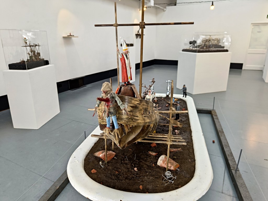 Furthermore, the jangling slogans sound in a landscape of dysfunction and decline. Are Hanmer’s crazed men drinking from their cups? Everyone in his work seems starved, mean and shrunken, the thin little men as well as the skeletal humanoids. And they preside over a starved world, all resources poured into their elaborate ritualistic structures while basic needs are neglected: as their vessel sinks into the bathtub, the crew of a wooden warship look up at the rigging where a tattered flag flies. They’re so consumed with symbols that they’ve forgotten to keep themselves afloat. This suggests something piercing about the state of Britain after twelve years of Tory rule: endless pageantry against ever-decreasing prosperity; a fixation on symbols even as, like the prospect of blue passports being manufactured abroad, those symbols are hollowed out.